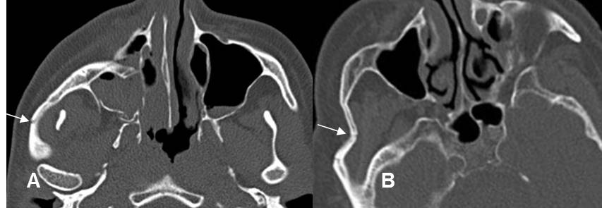 A y B: TAC axial. Fracturas del arco cigomático. Lineal en A y deprimida en B.