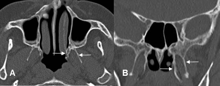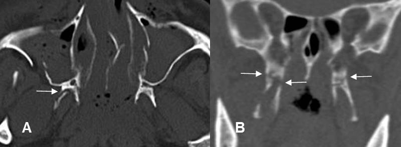 A: TAC axial y B: TAC reconstrucción coronal. Láminas pterigoideas  normales.