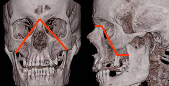 Fractura en forma  piramidal, con ápex en la sutura nasofrontal y base en los dientes. Compromete el borde interno, piso de la órbita y el hueso malar.