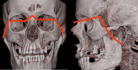 B: TAC reconstrucción 3D. Huesos malares normales. Sutura cigomático-frontal. (Flecha delgada), cigomático-maxilar (Flecha gruesa) y cigomático-temporal. (Punta de flecha).