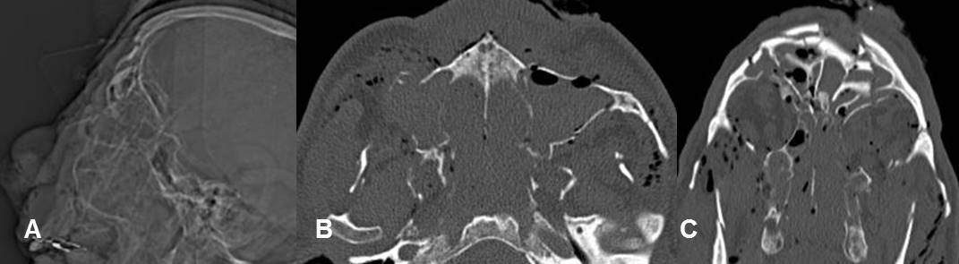 A: Rx lateral, B: TAC axial y C: TAC reconstrucción coronal. Severo estallido facial con fracturas deprimidas de la parte anterior de la cara y Lefort III bilateral.
