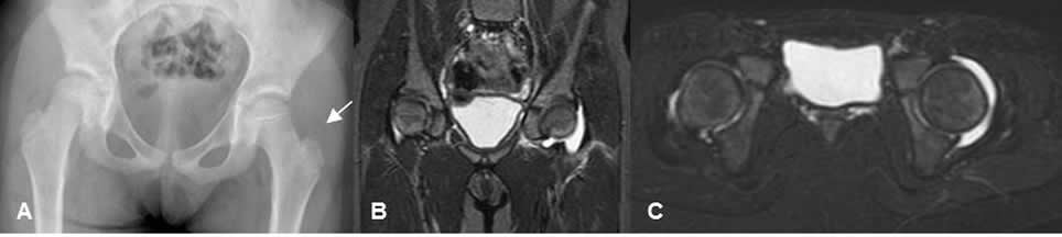 B: RM coronal y C: RM axial en STIR. Se confirma el derrame articular, por artritis infecciosa.