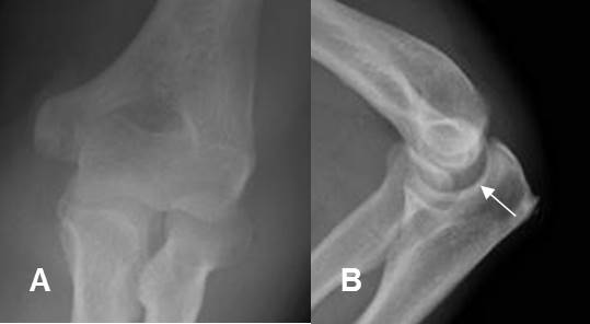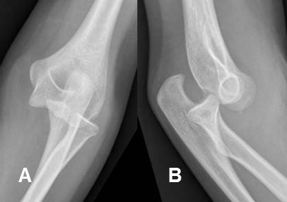 B: Rx lateral. Aumento del espacio entre el epicóndilo medial y la cavidad coronoides, por subluxación.