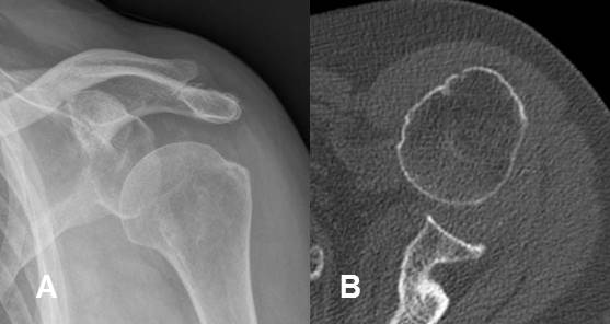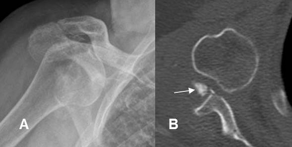 A: Rx AP de hombro y B: TAC axial. Desalineación anterior de la articulación glenohumeral, con pérdida parcial de la relación articular.