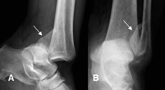 A: Rx lateral y B: Rx AP. Luxación anterior del tobillo, con fractura desplazada de la tibial distal.