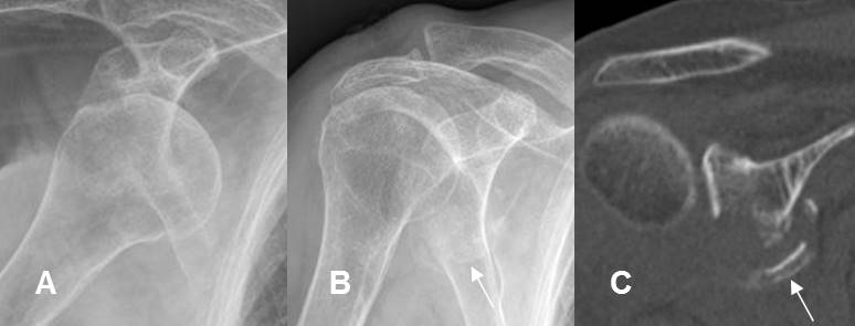 C: TAC reconstrucción coronal. Se confirma la luxofractura, con fractura desplazada y conminuta de la glenoides inferior.