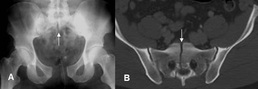A: Rx AP y B: TAC axial. Diastasis de la sínfisis púbica, conservándose íntegras las articulaciones sacroiliacas. Hay fractura vertical del sacro, sobre la línea media.