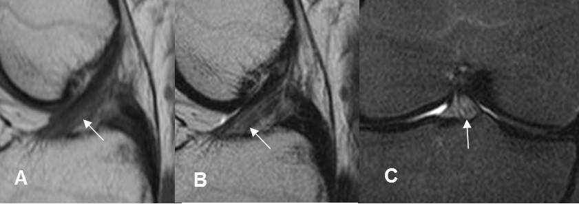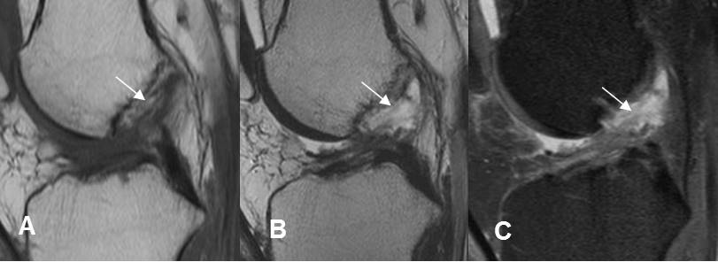 A: RM sagital en T1, B: RM sagital en T2 y C: RM sagital en STIR. Ruptura completa del LCA en su origen femoral, con cambios inflamatorios agudos.