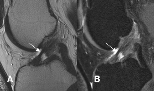 A: RM sagital en T2 y B: RM sagital en STIR. Adelgazamiento, con solución de continuidad en la mayoría de las fibras del LCA, por ruptura parcial.