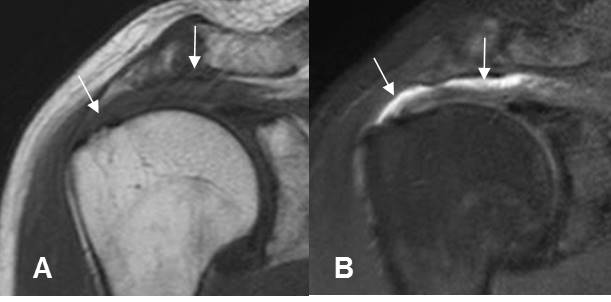 A: RM coronal en T1: Ausencia de la grasa normal en la bursa.