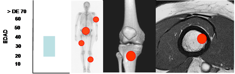 Mayor frecuencia entre los 20 y 40 años. Predominio en los huesos largos y el sacro.
