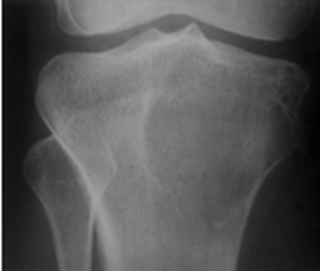Rx AP. Imagen excéntrica, lítica y parcialmente definida, en la metáfisis tibial, por tumor de células gigantes.