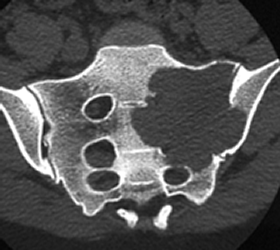 TAC reconstrucción coronal. Imagen expansiva y lítica, en el alerón del sacro, sin ruptura de la cortical, por tumor de células gigantes.