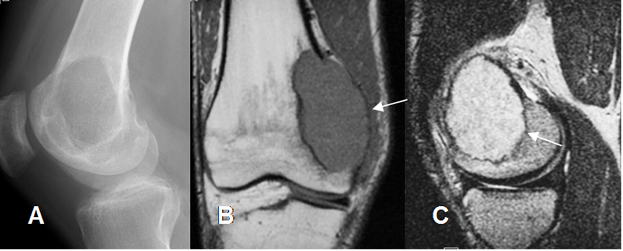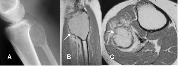 A: Rx lateral, B: RM coronal en T1 y C: RM sagital en T2. Lesión metafisiaria hipointensa en T1 e hiperintensa en T2, que rompe la cortical y forma una seudocápsula hipointensa en ambas secuencias.