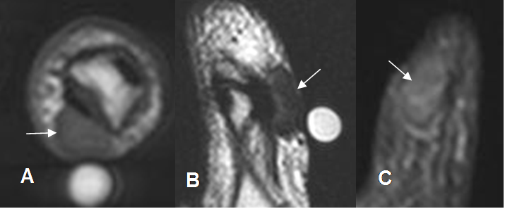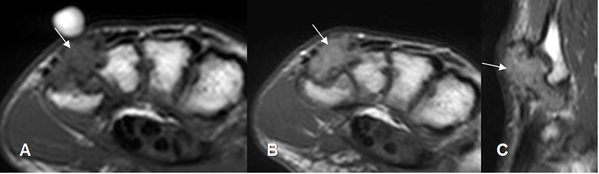 A: RM axial en T1, B: RM sagital en T2 y C: RM coronal en STIR. Tumor de células gigantes en la vaina tendinosa flexora del pulgar, manifestado por imagen ovalada y sólida, hipointensa en todas las secuencias.