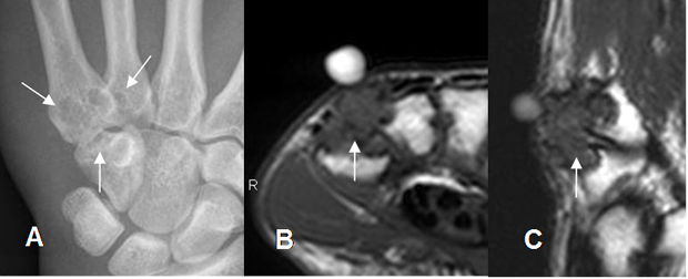 A: Rx AP. Erosión de bordes escleróticos, en las bases del 4º y 5º metacarpiano y el hueso ganchoso. B: RM axial en T1 y C: RM sagital en T2. Masa de tejidos blandos hipointensa en ambas secuencias, que erosiona el hueso, por tumor de células gigantes.