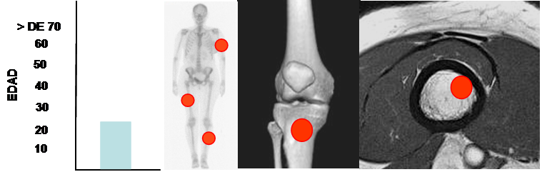 Aparece en pacientes menores de 25 años. Predominio en los huesos largos.