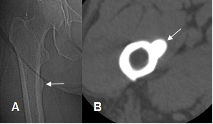 A: Rx AP y B: TAC axial. Area de exostosis en la diáfisis femoral, por osteocondroma.