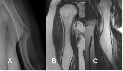 A: Rx AP, B: RM coronal en T1 y C: RM sagital en T1. Exostosis del húmero con continuidad de la medular osea, por osteocondroma.