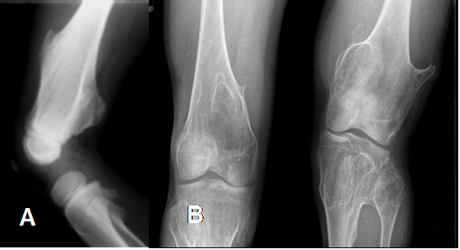 A: Rx lateral y B: Rx AP. Osteocondromatosis múltiple en diferentes pacientes .
