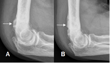 B: Rx lateral después de 1 año. Incremento e irregularidad de la reacción perióstica, del húmero distal.