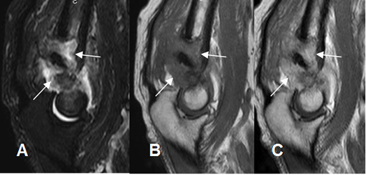 A: RM sagital en STIR, B: RM sagital en T1 simple y C: RM sagital en T1 con contraste.