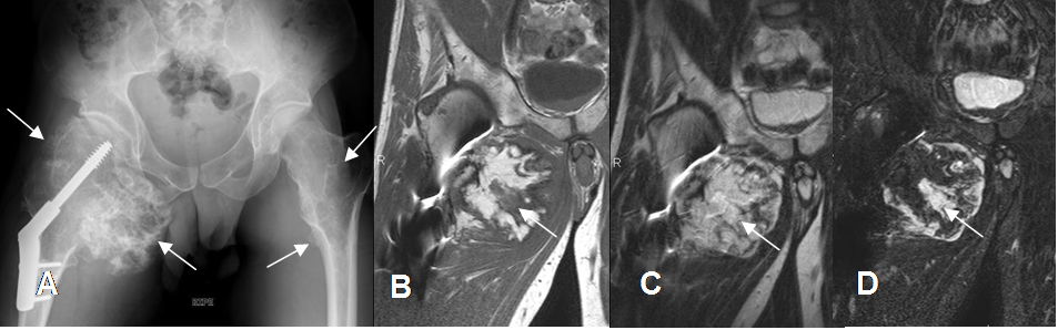 A: Rx AP. Osteocondromatosis múltiple (Flechas) y fractura patológica en la cadera derecha, fijada con material de osteosíntesis.