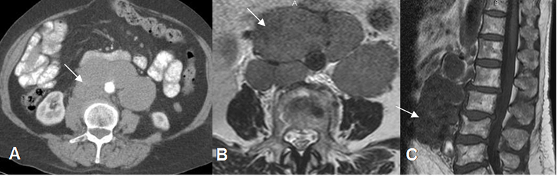 A: TAC axial, B: RM axial en T2 y C: RM sagital en T1. Gran cúmulo de adenopatías retroperitoneales, que rodean mas del 50% de la circunferencia de la aorta, por linfoma. Están en íntimo contacto con el cuerpo vertebral, pero sin comprometerlo.