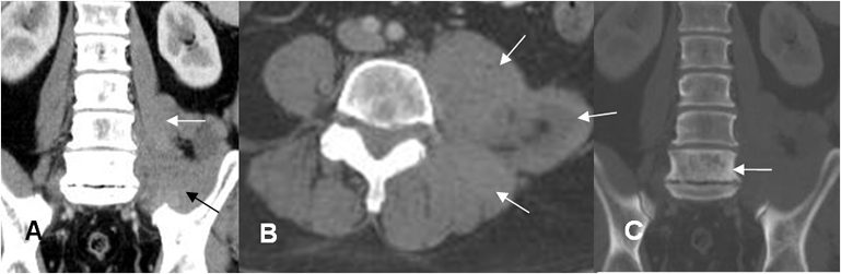 A: TAC reconstrucción coronal y B: TAC axial. Engrosamiento de los músculos psoas y paraespinales en el lado izquierdo.