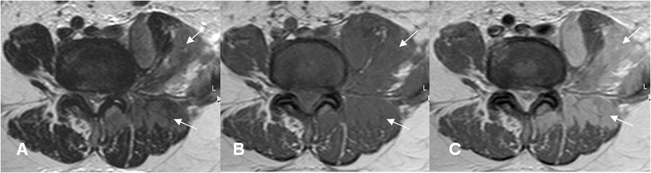B: RM sagital y C: RM coronal en T1 con contraste. Realce heterogéneo del contraste, en L5. La masa de tejidos blandos paravertebral