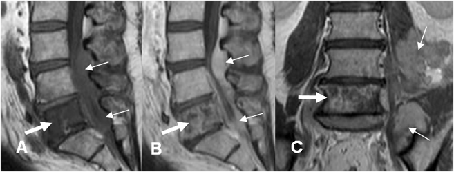 A: RM sagital en T1. Igual paciente anterior. Infiltración del cuerpo de L5. (Flecha gruesa). El canal medular está ocupado, por tejido blando. (Flechas delgadas).