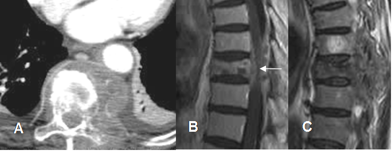 A: TAC axial, B: RM sagital en T1 con contraste y C: RM sagital en T2. Cúmulo de adenopatías paravertebrales dorsales, con compromiso vertebral y masa de tejidos blandos que se extiende al canal modular. (Flecha).