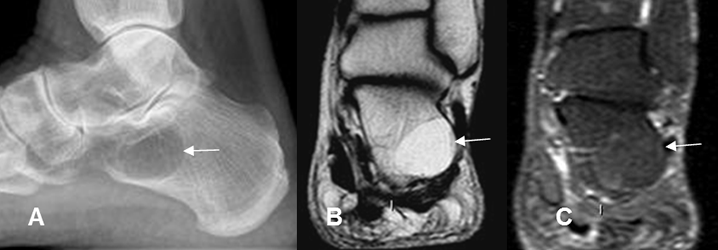 A: Rx lateral. Imagen redondeada, de bordes definidos y algo escleróticos, en la parte anterior del calcáneo, compatible con lesión benigna.