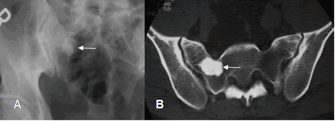 A: Rx AP y B: TAC axial. Imagen densa y espiculada en el alerón del sacro derecho,