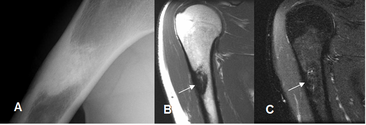A: Rx AP. Enostosis del húmero, con lesión densa y espiculada.