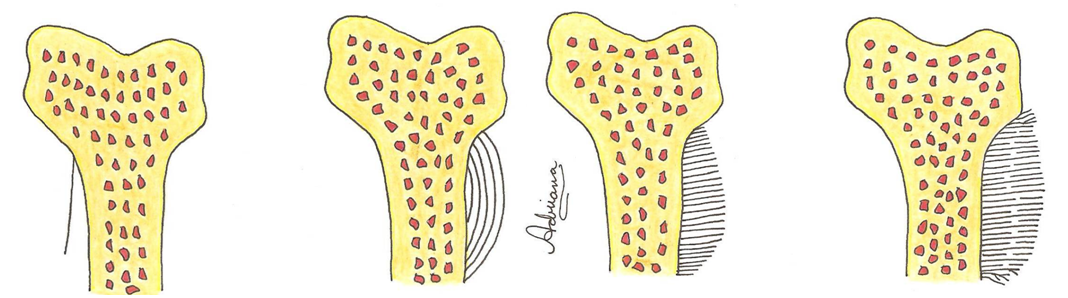 Diferentes tipos de reacción perióstica: Triángulo de Codman, capas de cebolla, sol naciente y peine.