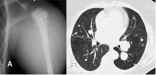 B: TAC axial. Múltiples nódulos pulmonares bien definidos, por enfermedad metastásica.