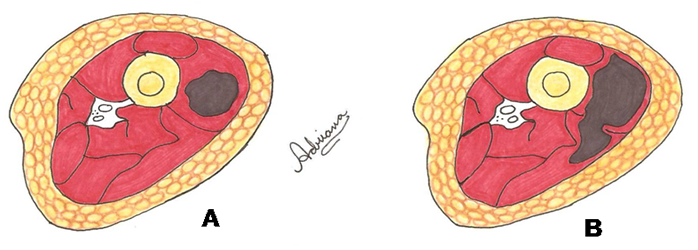 B: Lesión que del compartimiento lateral se extiende al posterior, por comportamiento agresivo.