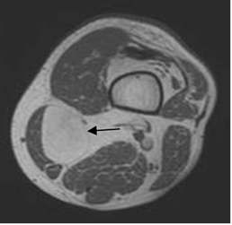 RM axial en T1. Lipoma intramuscular en el biceps femoral, que no cruza compartimientos.