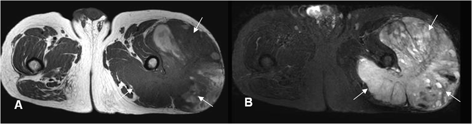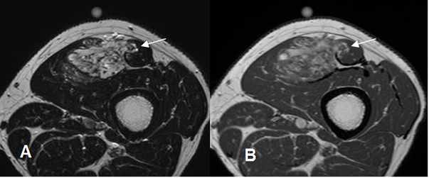 A: RM axial en T1 y B: RM axial en STIR. Tumoración de tejidos blandos en el muslo, que cruza compartimientos e invade los grupos musculares, correspondiendo a sarcoma de tejidos blandos.