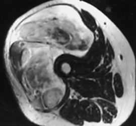 RM axial en T2. Liposarcoma que compromete los músculos vastos interno y externo, recto anterior y recto intermediario.