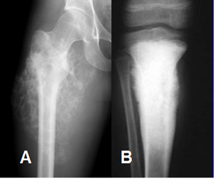 A y B: Rx AP. Calcificación osteoide de la matriz en patrón algodonoso y densa. (En marfíl).