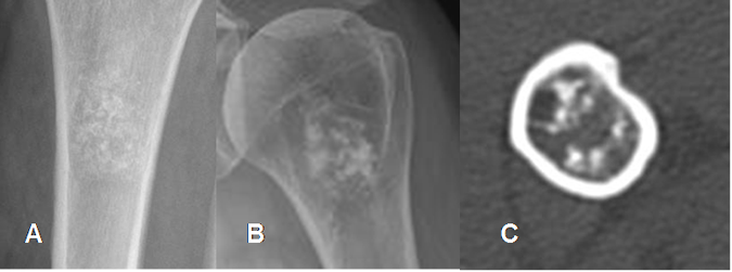 También pueden encontrarse calcificaciones en el tejido necrótico o degenerado, fracturas patológicas o reacción esclerótica del hueso. (3, 2).